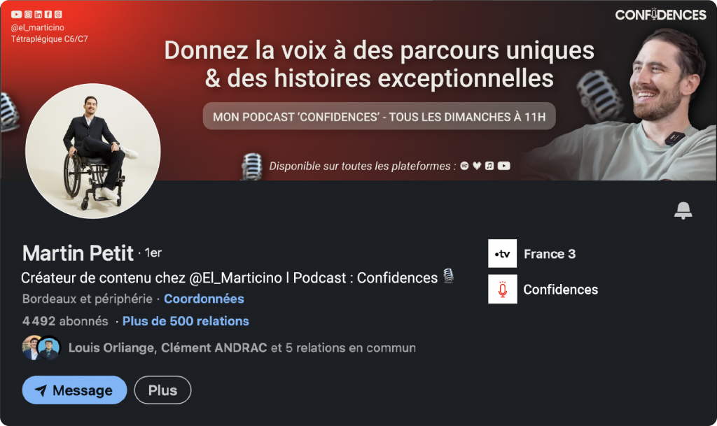 Martin PETIT, known as @el_marticino, is a French influencer and C6/C8 quadriplegic who shares his daily life on social media. He recently launched a podcast called Confidences, where he gives a voice to remarkable journeys and extraordinary stories.