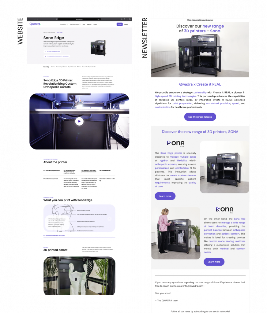The launch began with defining the product’s identity, including its core values, positioning and logo design. Clear and compelling messaging was developed to highlight SONA’s benefits for orthotic and prosthetic care, adapted across multiple formats. A multi-channel campaign was then implemented, featuring newsletters, a dedicated web page, social media content and brochures. Internally, sales and marketing teams were provided with aligned tools and assets to ensure a smooth and unified launch.