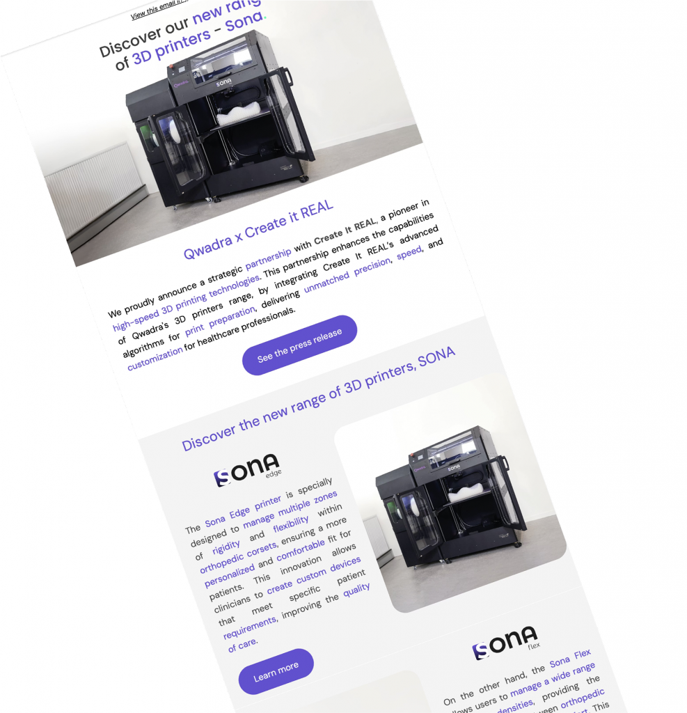 Execute a visually compelling and informative email campaign designed to introduce the SONA 3D printers to a broad subscriber base in multiple languages (French, English, Spanish, German). The campaign focused on generating curiosity, driving engagement and sparking interest in the new product.